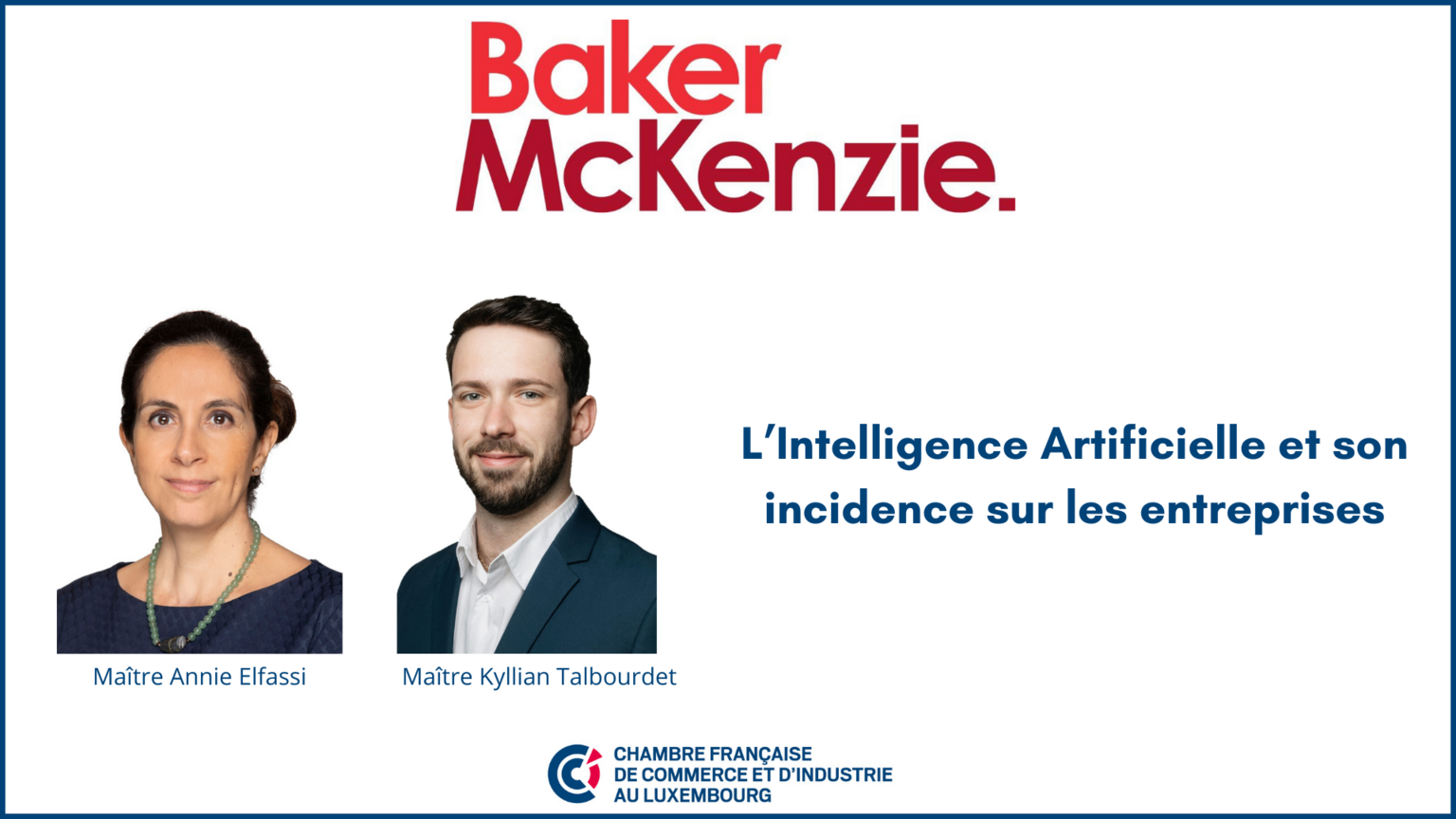 La Chambre Française de Commerce et d’Industrie au Luxembourg en partenariat avec Baker McKenzie Luxembourg a le plaisir de vous convier à une conférence cocktail qui se voudra interactive, sur le thème de "L'Intelligence Artificielle et son incidence sur les entreprises".