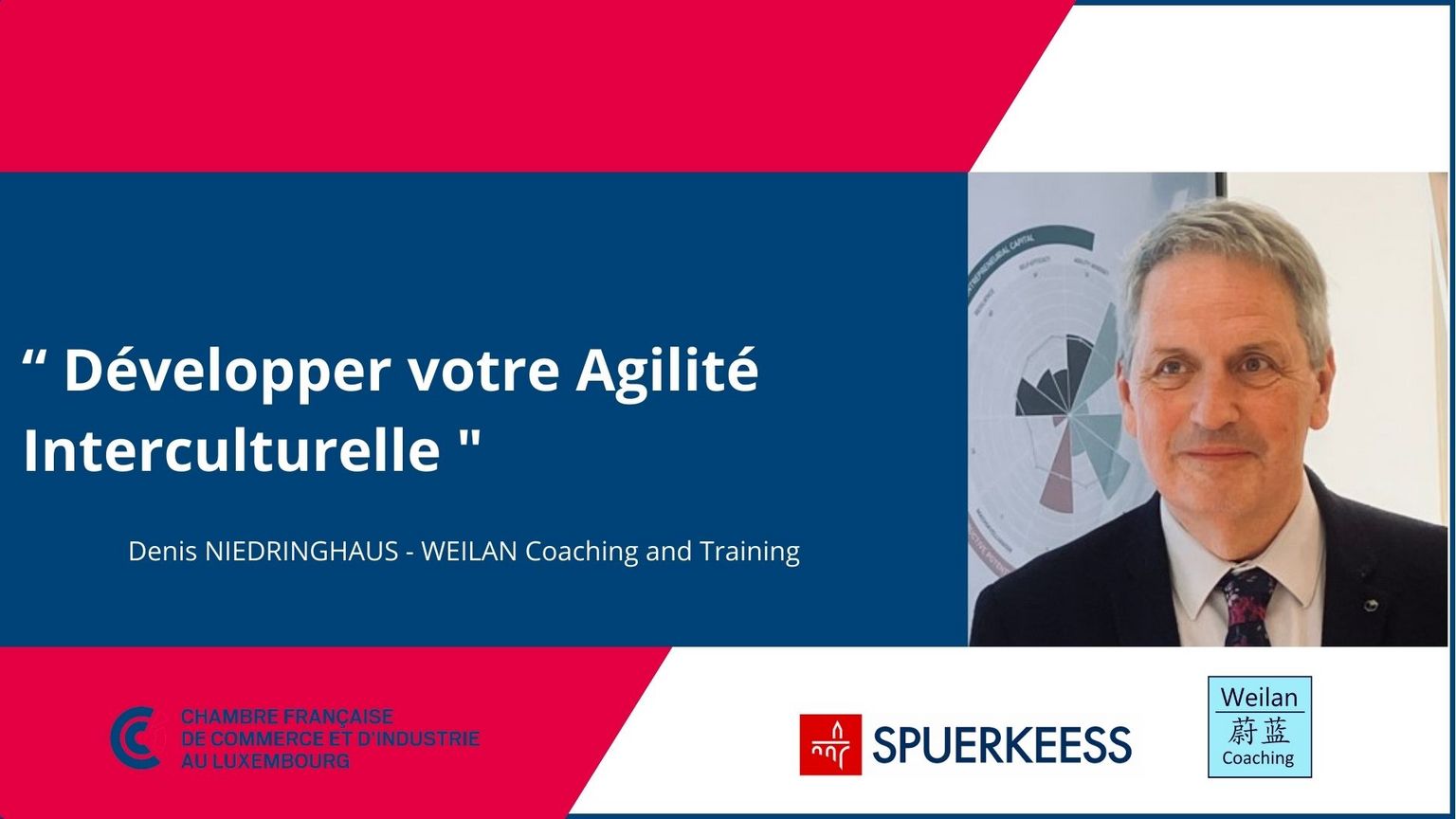 La Chambre Française de Commerce et d'Industrie au Luxembourg vous invite à participer à son prochain événement "Développer votre Agilité Interculturelle" présenté par Denis Niedringhaus - Weilan Coaching & Training, avec le soutien de Spuerkeess le jeudi 14 mars 2024 à 13h30.