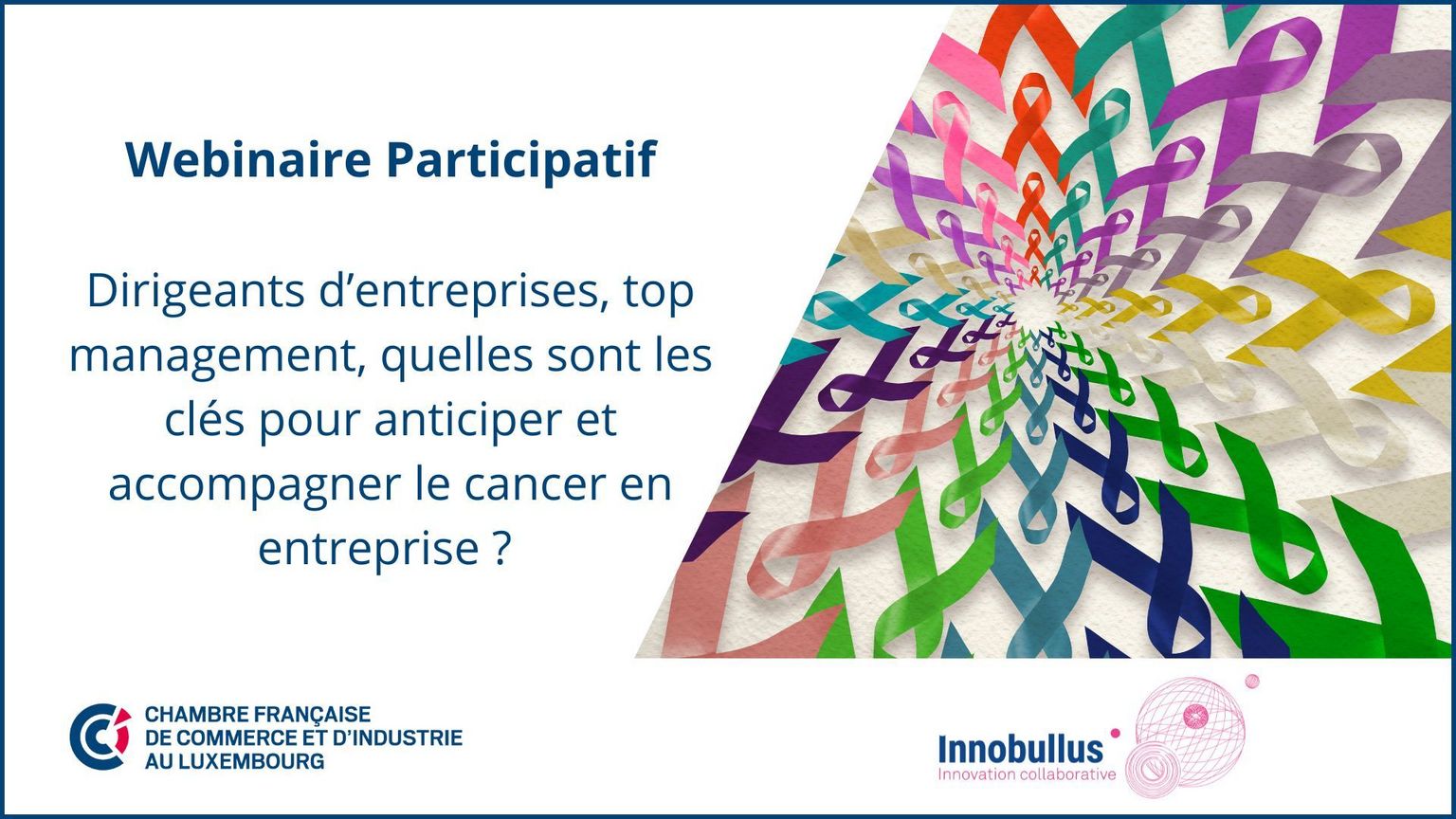 La Chambre Française de Commerce et d'Industrie au Luxembourg, a le plaisir de vous inviter à un webinaire participatif dédié à un sujet crucial : Quelles sont les clés pour anticiper et accompagner le cancer en entreprise ?