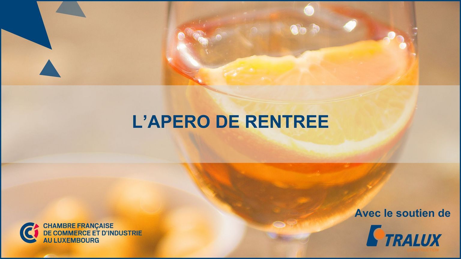 La Chambre Française de commerce et d'industrie au Luxembourg a le plaisir de vous inviter à participer à "L' Apéro de rentrée de la Chambre", le jeudi 19 septembre à 18h30 au Tender Bar du restaurant Porta Nova.