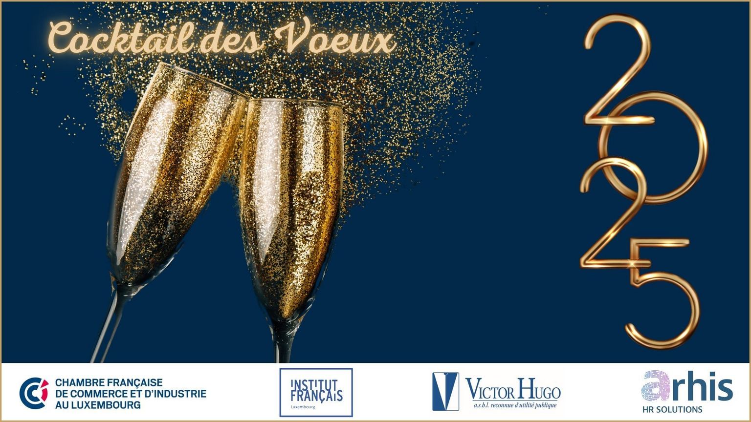 À l’aube de cette nouvelle année, Fabrice Poncé, Président du Conseil d’Administration et l'ensemble des Administrateurs de la Chambre Française de Commerce et d’Industrie au Luxembourg ont le plaisir de vous convier au Cocktail des Vœux de la Chambre pour partager ensemble un moment convivial et chaleureux.