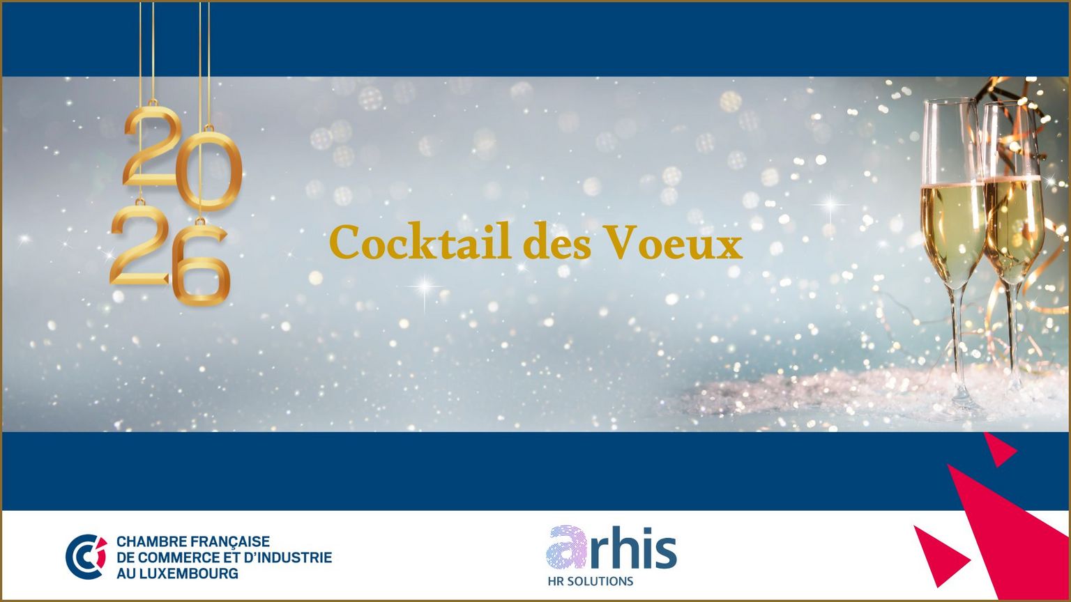 À l’approche de cette nouvelle année, Dominique Lo Sardo, Président du Conseil d’Administration, ainsi que l’ensemble des Administrateurs de la Chambre Française de Commerce et d’Industrie au Luxembourg ont le plaisir de vous inviter au Cocktail des Vœux avec le soutien de Arhis HR Solutions.
